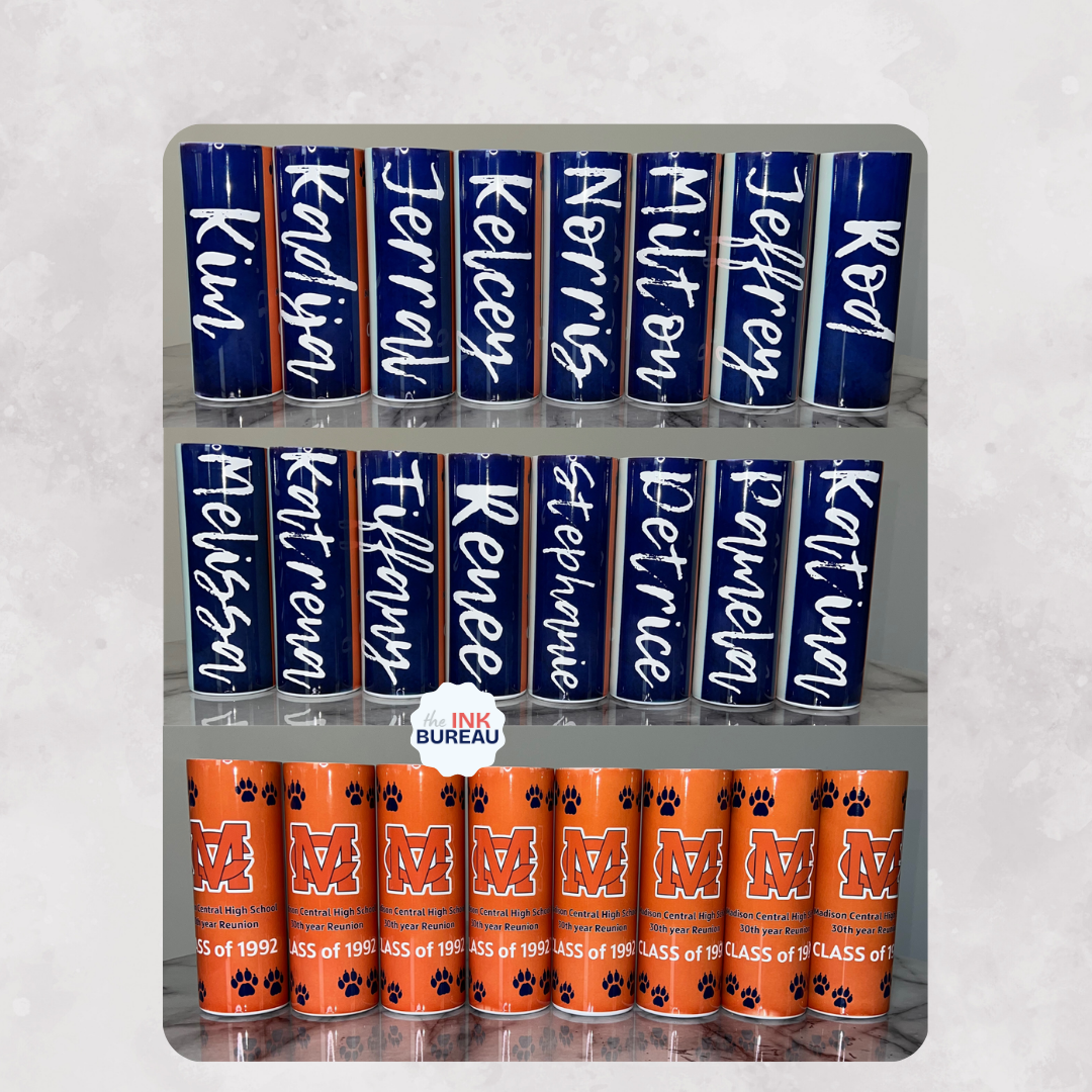 Celebrate your class reunion with insulated tumblers! Keep drinks hot or cold for hours, personalized with your class year and school logo. Perfect keepsakes to spark memories and show school pride.